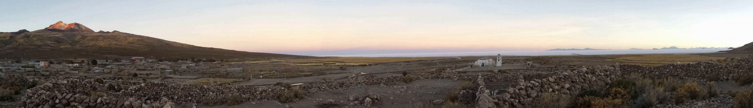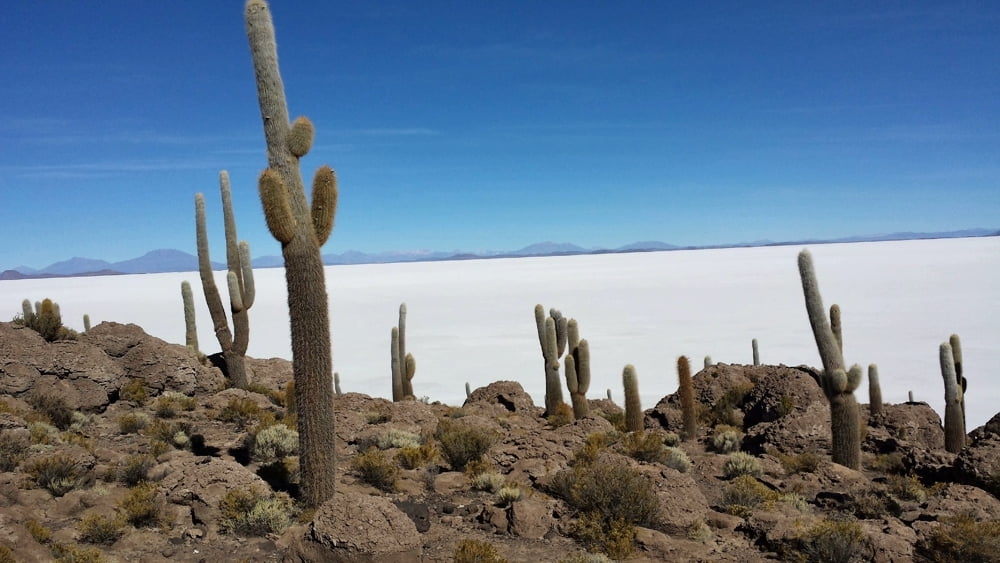 After entering the Uyuni Salt Flats from the South edge and taking funny perspective photos with your driver and guide, the next stop appears in the distance. Crossing over Isla del Pescado, an island popping up on the salt flat with hundreds of years old monster-sized cacti marks about halfway across the ancient dried up lake. The final main attraction of the day is after enduring the vast and blinding whiteness of the Uyuni Salt Flat. The town of Coqueza Canton on the north edge of the flat and at the base of Volcano Tunupa presents amazing opportunities to take pictures. After a quick lunch, drive and then hike up the side of Volcàn Tunupa for an endless panoramic view of the Uyuni Salt Flat, surrounding mountains, and villages below at Mirador Chatahuana.